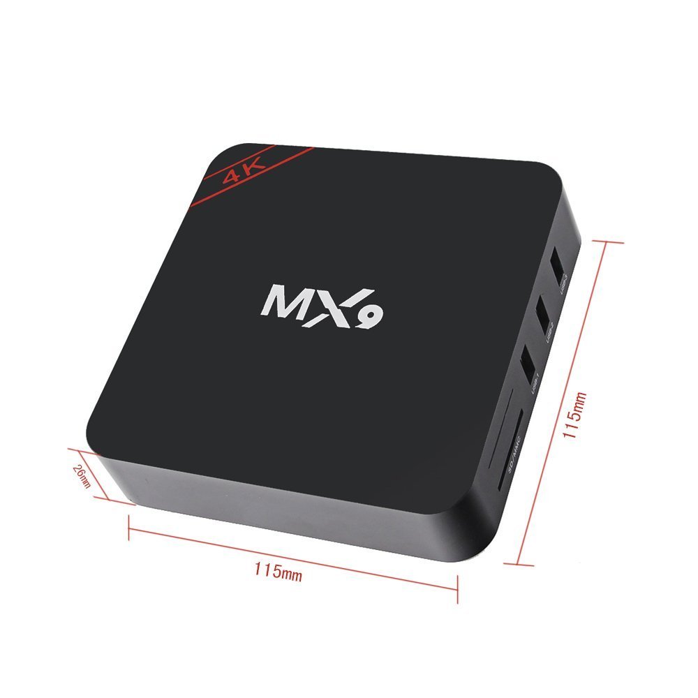 Android Box MX9 4K trang bị chip xử lý Rockchip RK3229 A7 4 lõi, chip đồ họa lõi tứ Mali 400, 1G RAM, bộ nhớ trong 8GB NAND Flash, OS Android Kitkat 4.4, giải mã 4K. Android tv box MX9 4K do Rockchip RK3229 giúp chất lượng phim ảnh khá mượt, sắc nét, chân thực, thể hiện các chuẩn màu tối tương đối tốt. Ngoài ra, đời chip Rockchip còn cải tiến hiệu năng đáng kể, tiết kiệm điện và tỏa nhiệt lượng thấp.